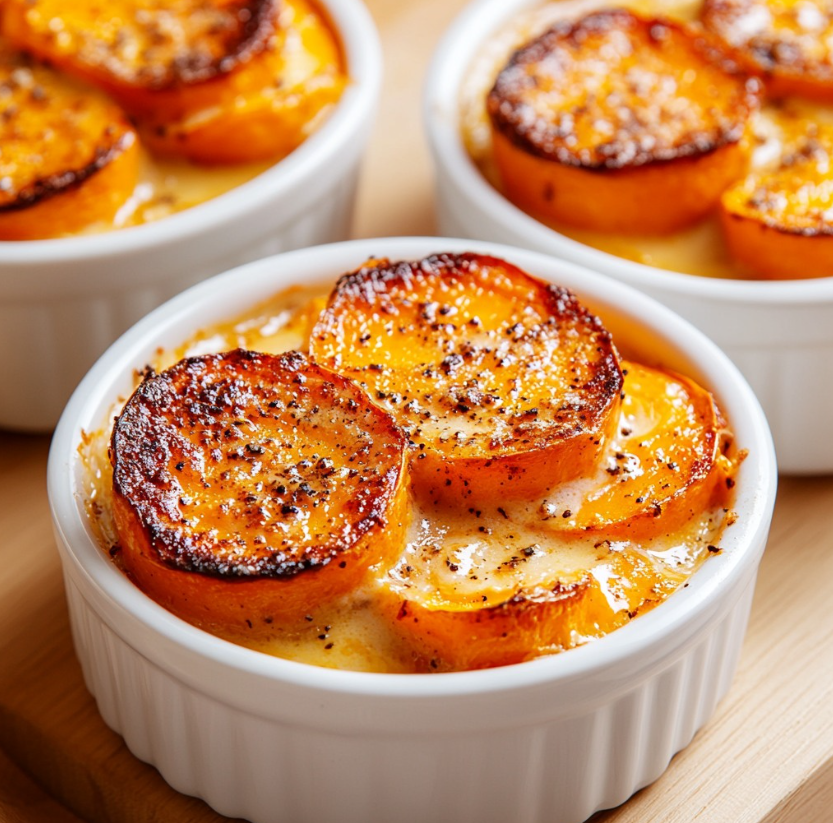 Dno i boki naczynia do zapiekania lub pojedynczych foremek obficie posmaruj masłem. Ten krok zapobiega przywieraniu batatów i ułatwia późniejsze porcjowanie zapiekanki. Masło dodatkowo wzbogaca smak i pomaga uzyskać delikatnie rumianą powierzchnię od spodu.