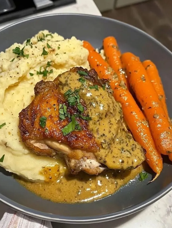Kremowy kurczak z ziołami, podany z aksamitnym purée ziemniaczanym i pieczonymi marchewkami, to danie kompletne i harmonijne. Łączy w sobie delikatność, świeżość oraz wyraźną nutę domowej przyjemności. Soczyste mięso drobiowe otulone jest gładkim, aromatycznym sosem na bazie śmietanki i ziół, purée wnosi miękkość i kremową strukturę, a marchewki – słodką, lekko karmelizowaną kontrę.
