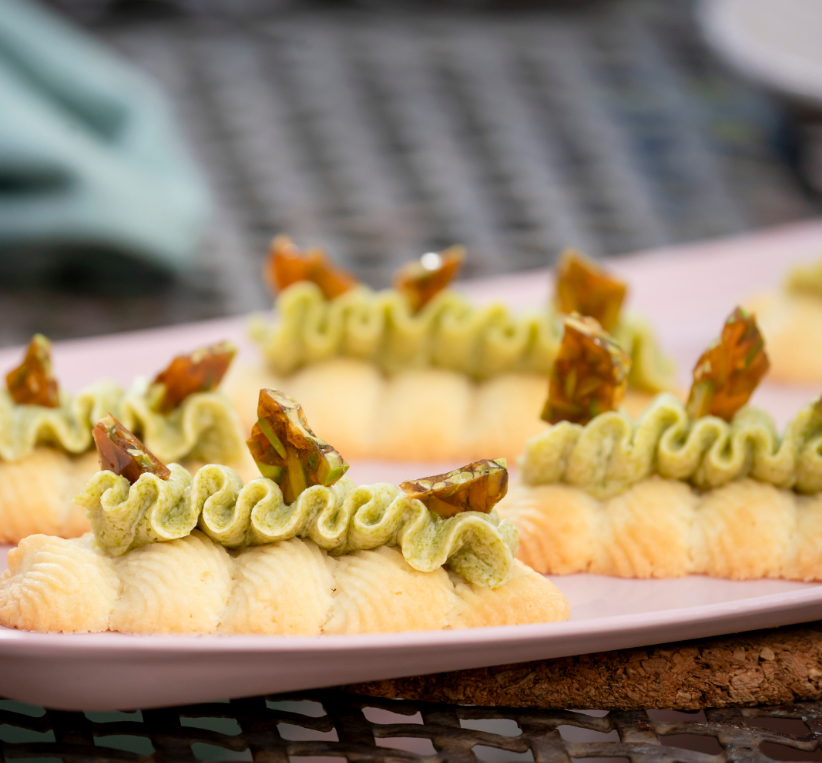 Pistachio Shortbreads Darrena to nowoczesna interpretacja tej klasyki – niezwykle lekkie i puszyste ciasteczka z dekoracyjnym, wytłaczanym wzorem przypominającym muszelkę. Całość zwieńczona jest aksamitnym ganache pistacjowym oraz posypką z karmelizowanych pistacji, które dodają tekstury i głębi smaku.
