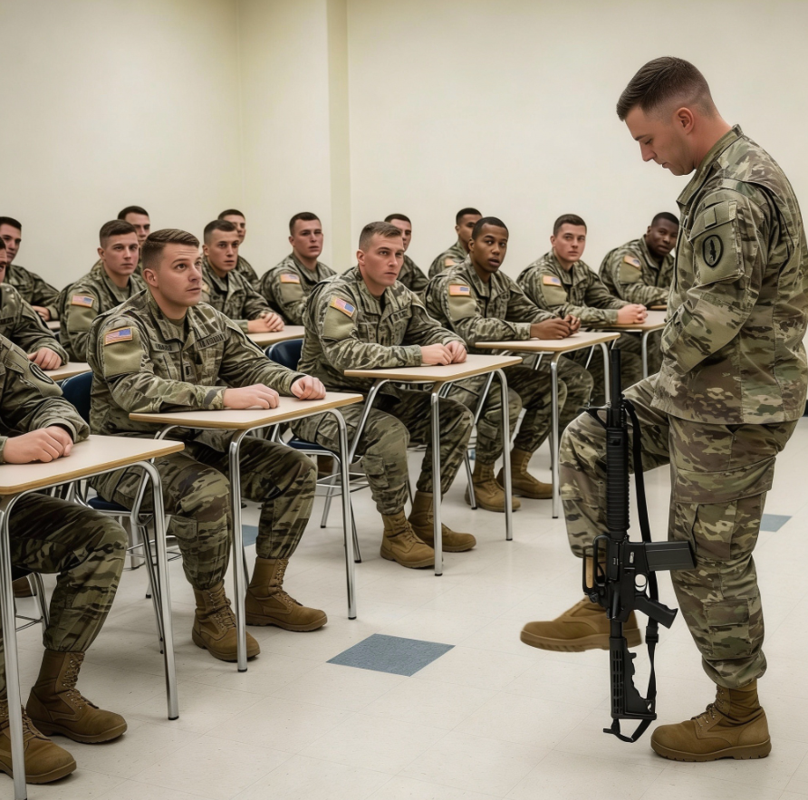 Sala wykładowa w Fort Benning pulsowała beztroską pewnością siebie. Trzydziestu dwóch kandydatów na oficerów siedziało za metalowymi ławkami, z nonszalancją opierając się o oparcia krzeseł, z nogami skrzyżowanymi w ciężkich wojskowych butach. Karabiny oparto o ścianę, jakby były jedynie kolejnym elementem wyposażenia, a nie narzędziem wymagającym szacunku. W powietrzu unosił się gwar rozmów, śmiech i poczucie, że to będzie kolejny rutynowy dzień szkolenia.