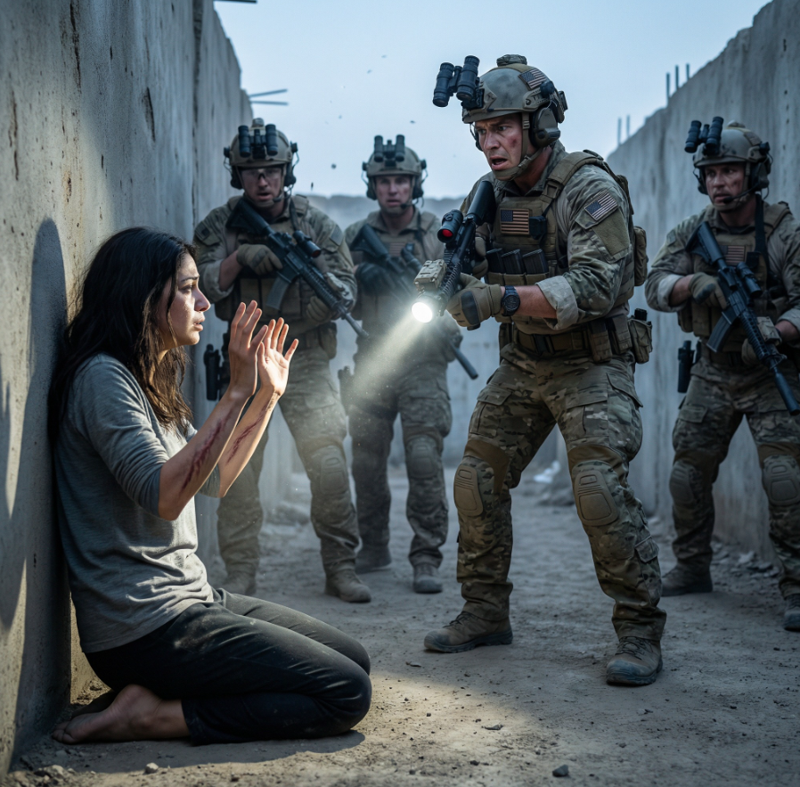Bosa. Wychudzona. Owinięta znoszonym, szarym szalem. Jej dłonie drżały, gdy pięciu operatorów skierowało lufy karabinów w stronę jej klatki piersiowej. Zamarła natychmiast, z szeroko otwartymi oczami i płytkim oddechem. Była wyraźnie nieprzeszkolona, przerażona i kompletnie bezbronna.