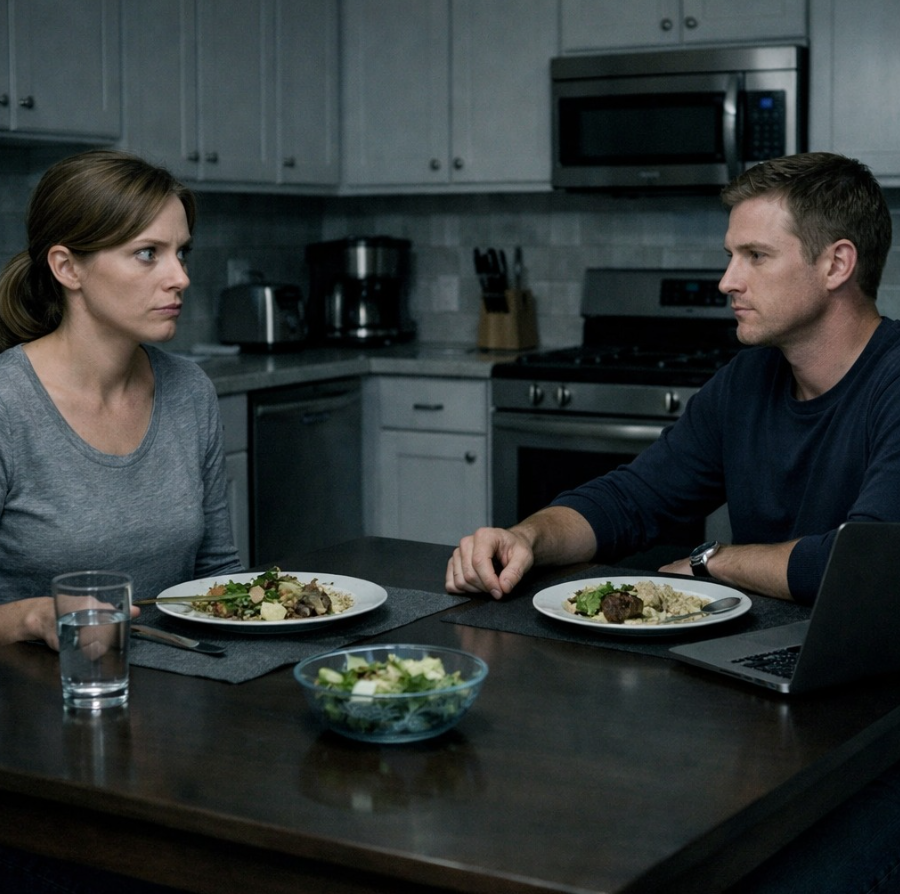 Mark siedział naprzeciwko mnie przy naszym stole z litego, odzyskanego drewna, przeżuwając kurczaka, którego przygotowanie zajęło mi dobrą godzinę – marynowanie, smażenie, polewanie sosem – jakby brałam udział w konkursie na Żonę Roku. Kuchnia pachniała rozmarynem, cytryną i tym rodzajem wysiłku, który nigdy nie pojawia się na pasku wypłaty.