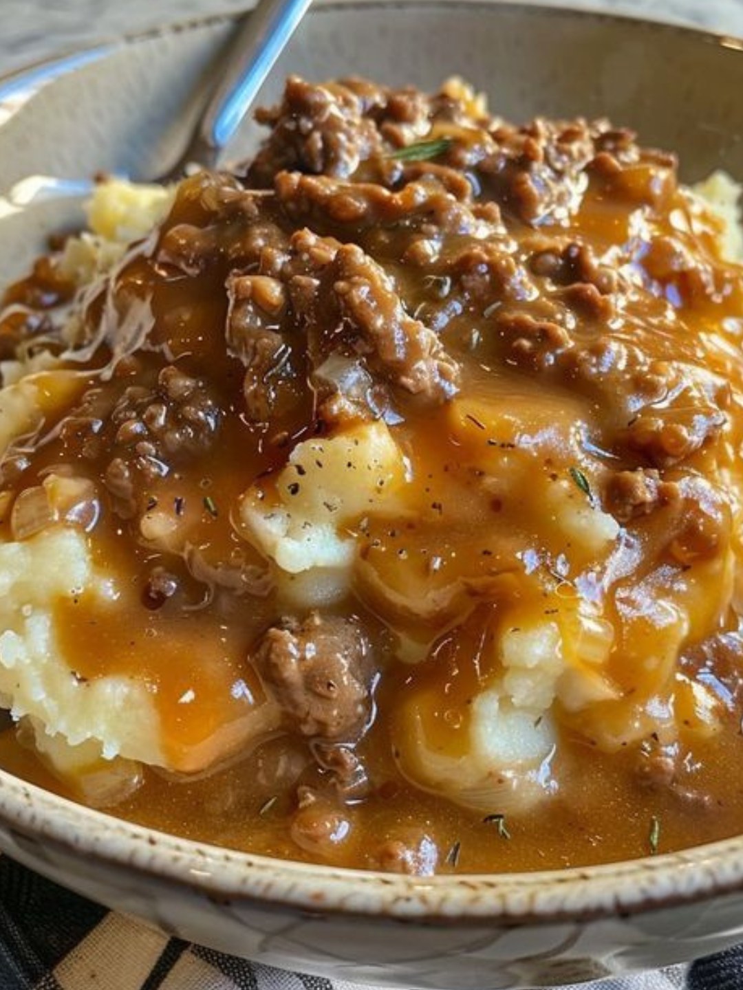 Mielona wołowina w sosie pieczeniowym podana na puszystych ziemniakach to czysta kulinarna pociecha — idealna po długim, wymagającym dniu, gdy potrzebujesz czegoś sycącego, prostego i niezawodnie pysznego.