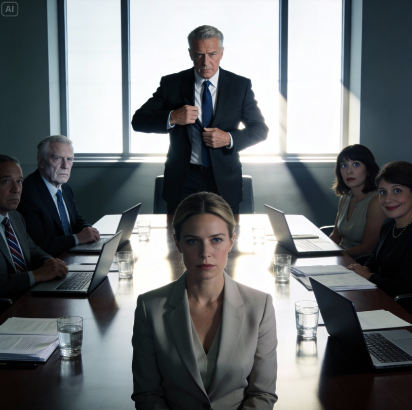 Do sali wszedł jego przełożony. Zamiast od razu zająć miejsce, zatrzymał się w pół kroku. Spojrzał prosto na mnie. Powoli wyprostował się, wygładził marynarkę i wyraźnie, tak aby wszyscy słyszeli, powiedział: