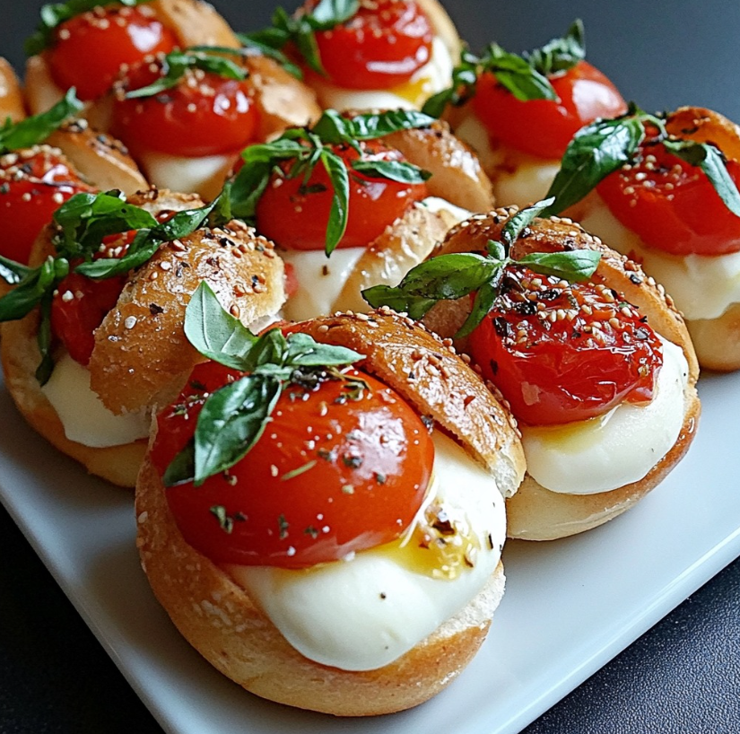 Mini bułeczki z mozzarellą, pomidorami confit i świeżą bazylią to elegancka, a jednocześnie bardzo prosta propozycja, która doskonale sprawdzi się jako przekąska na przyjęcie, lekka kolacja lub element bufetu. Połączenie delikatnego pieczywa, kremowej mozzarelli oraz intensywnie aromatycznych pomidorów powoli pieczonych w oliwie nawiązuje do klasycznych smaków kuchni śródziemnomorskiej.