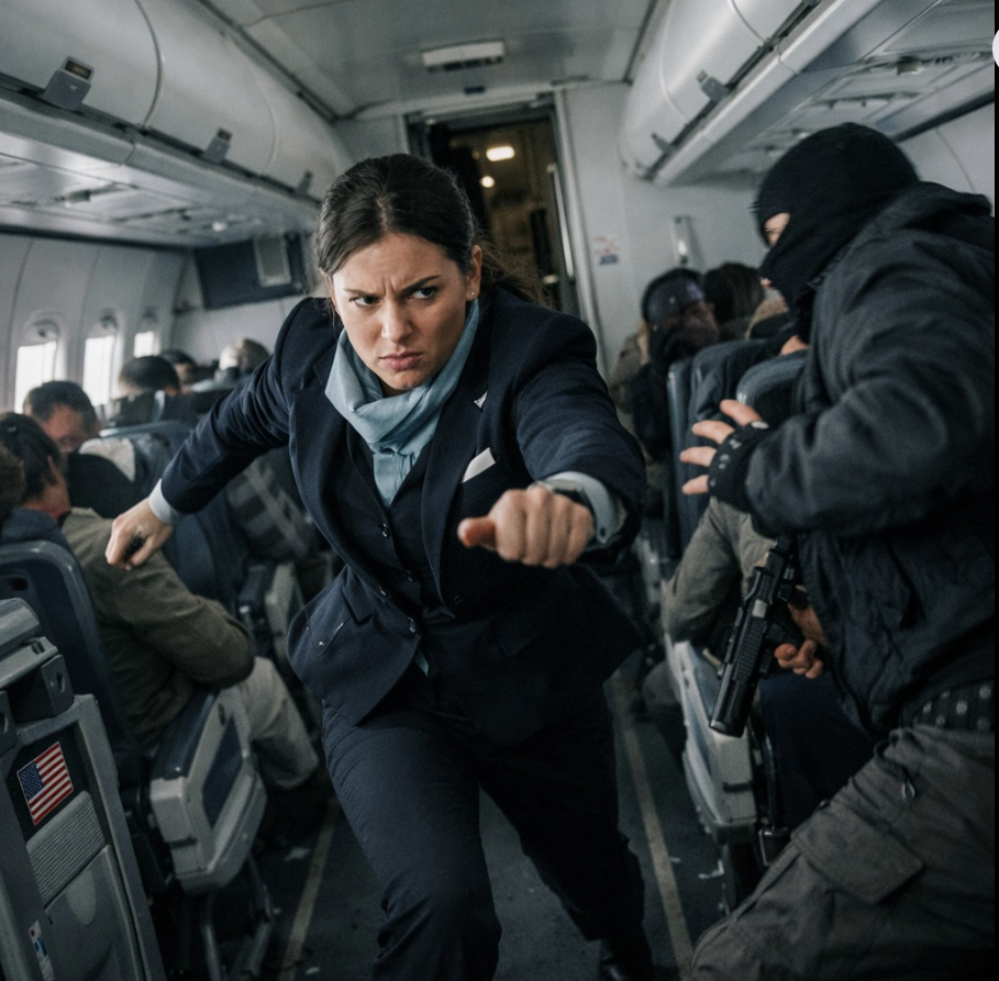 Najpierw był to tylko niepokojący dźwięk — zmiana tonu kabiny, podniesione głosy przy kokpicie, ciężkie kroki. Dwóch mężczyzn zerwało się z miejsc w przedniej części. Jeden był potężny, szeroki, zbudowany jak drzwi. Drugi szczupły, o ostrych rysach i oczach płaskich jak potłuczone szkło.