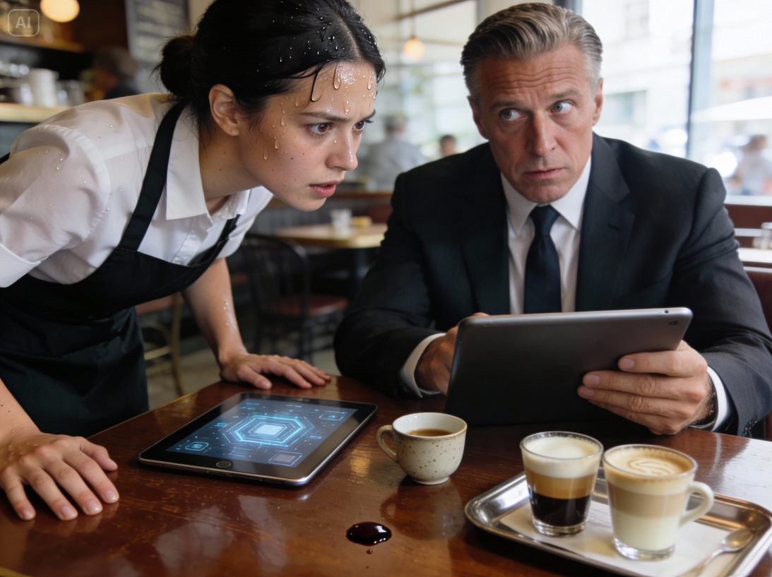 Balansowała tacą z trzema latte na mleku owsianym i jednym espresso z podwójną dawką, lawirując między ciasno ustawionymi stolikami ulubionej kawiarni ludzi w garniturach. Jej uniform — wyblakły czarny fartuch nałożony na bluzkę z lumpeksu — ciążył jak zbroja, której nie dało się zdjąć.