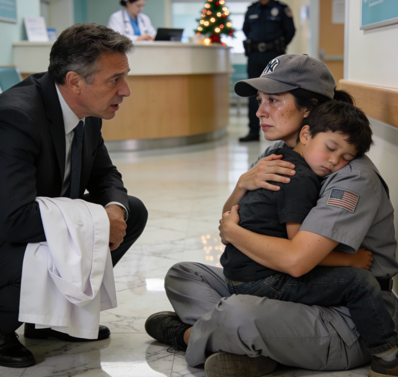 „Sprzątam tutaj” — powiedziała, a słowa rozpadały się w drodze na zewnątrz. „Każdej nocy. Myję korytarze. Proszę. Ma na imię Leo. Jest całym moim światem”.