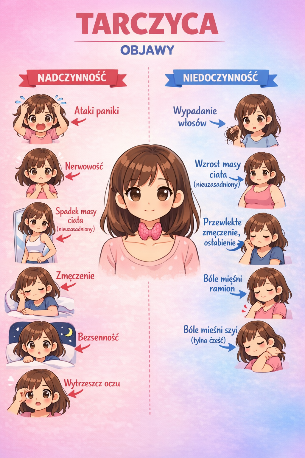 To właśnie dlatego objawy nadczynności i niedoczynności tarczycy są tak różne i często przypominają zupełnie inne schorzenia. Bez zrozumienia mechanizmu działania hormonów łatwo je pomylić z problemami natury psychicznej lub ogólnym przemęczeniem.