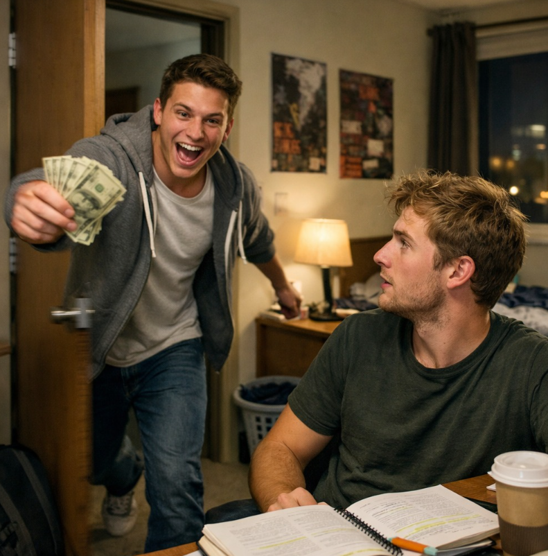 Drzwi otworzyły się z impetem, jakby Marcus szturmował plażę — z tą różnicą, że zamiast hełmu miał perfekcyjną fryzurę, a zamiast karabinu trzymał trzy świeże, chrupiące banknoty studolarowe, rozłożone wachlarzem niczym sztuczka iluzjonisty.