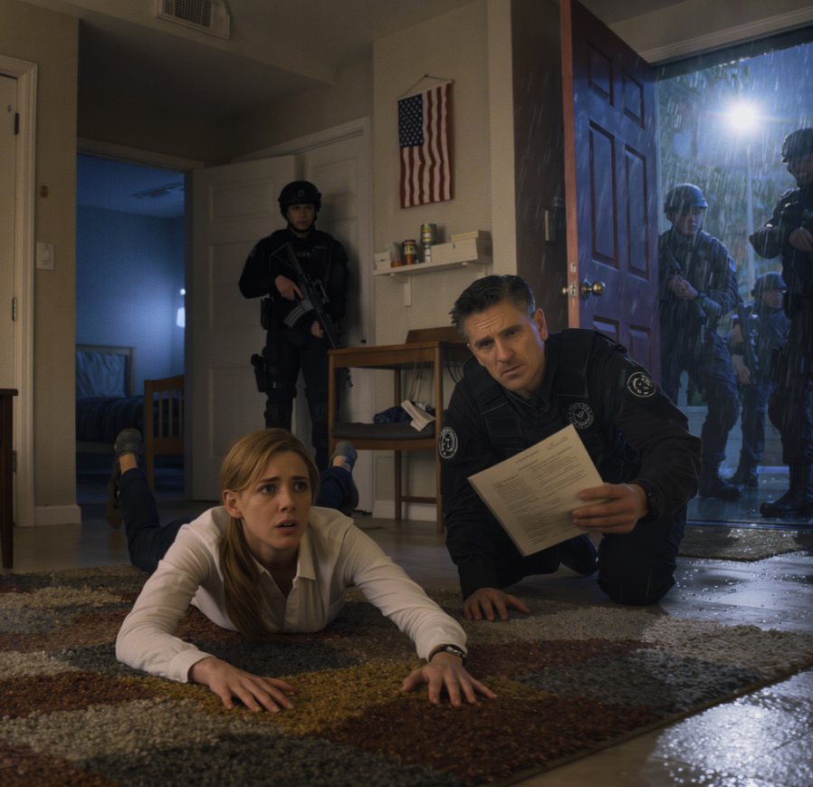 Mój mózg nie nadążył z przerażeniem. Po prostu wykonał polecenie. Upadłam na podłogę, dłonie płasko, serce próbowało wyrwać mi się z klatki piersiowej. Widziałam czarne hełmy, taktyczne kamizelki, broń wycelowaną w mój salon. To nie była zwykła policja. To był oddział SWAT — sceny, które ogląda się w wiadomościach i myśli: „To nie moje życie”.