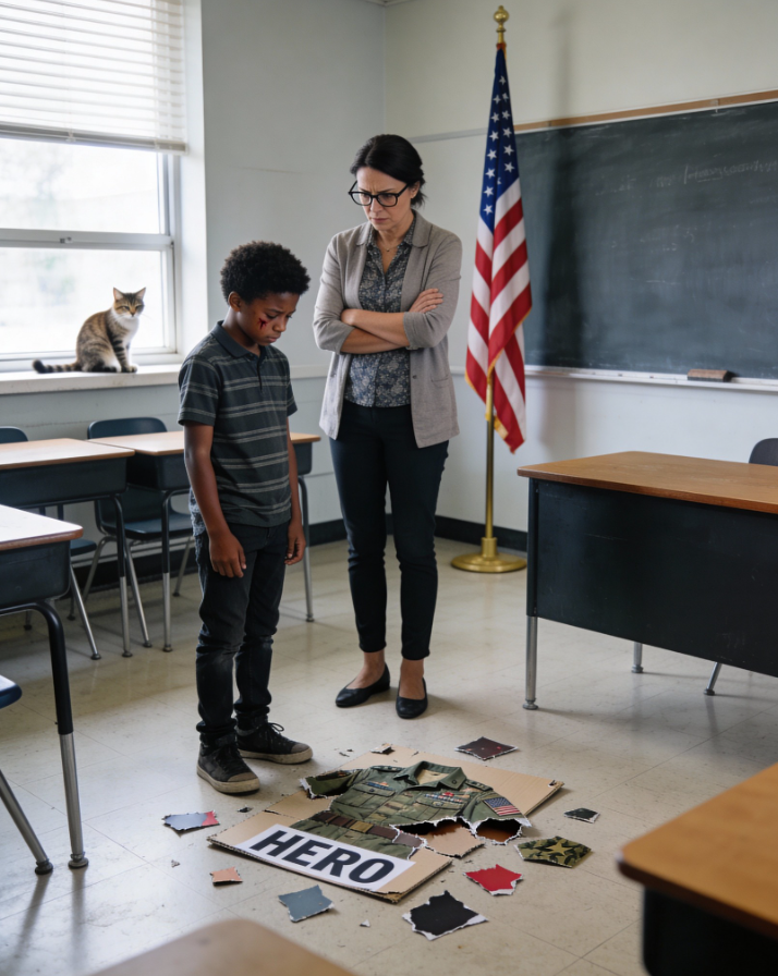 Rozdarła planszę na pół. Ten dźwięk odbił się echem od ścian klasy, potęgując upokorzenie, które zalewało mnie falami. Zdjęcie mojego ojca – generała Roberta Washingtona w galowym mundurze, z czterema gwiazdkami na ramionach – zostało przecięte na dwoje.