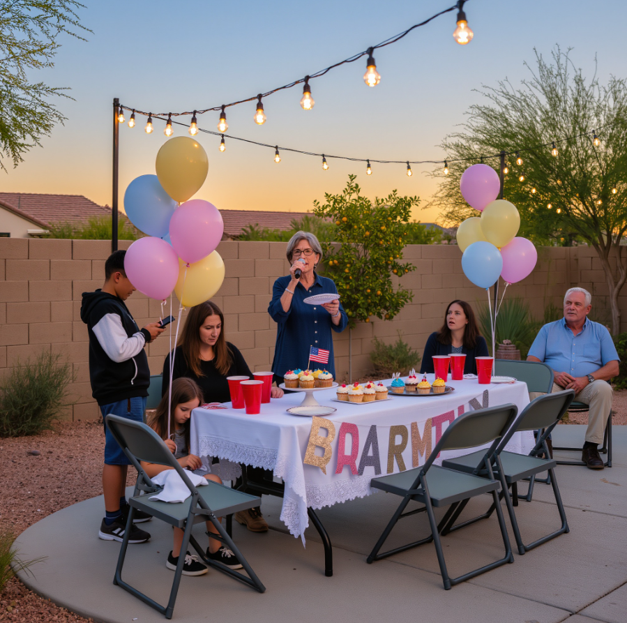 Mama wstała przy stole piknikowym, trzymając papierowy talerz tak, jakby był mikrofonem.