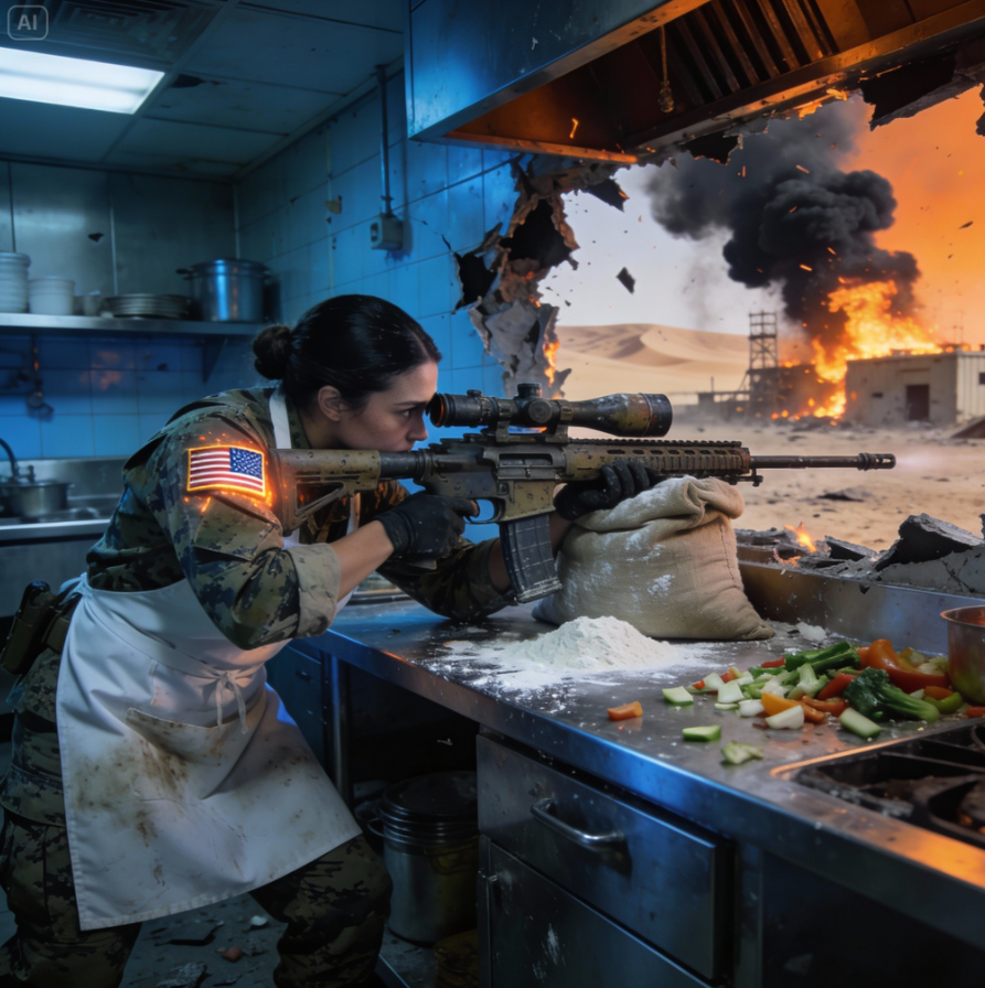 Mój dzień zaczynał się o 04:00, na długo przed tym, zanim słońce odważyło się wzejść nad syryjską pustynią. Mesa była moją klatką i moim królestwem. Poruszałam się wśród stalowej ciszy z rytmem, który przeraziłby ich, gdyby kiedykolwiek zechcieli spojrzeć. Siekaj. Kroisz. Dzielisz. Moja praca nożem nie była tylko kulinarna — była chirurgiczna. Mechaniczna. Ostrze poruszało się z szybkością i precyzją wynikającą z całego życia dyscypliny. Ale dla zaspanych komandosów wchodzących o 05:30 byłam tylko kobietą krojącą cebulę.