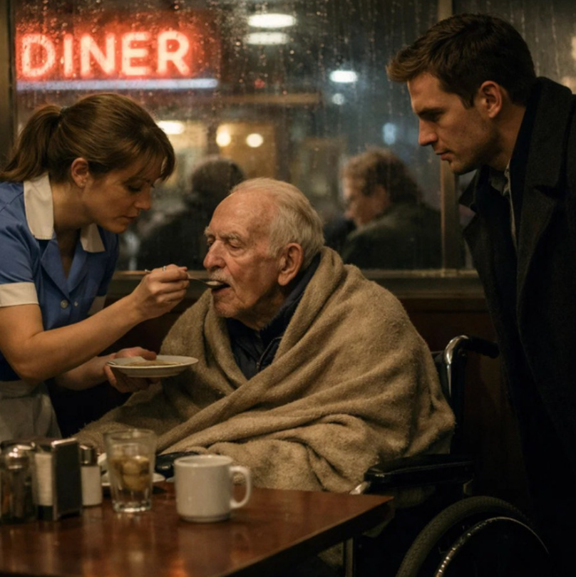 Szczęka mężczyzny trzęsła się, gdy przełykał. Elena nie popędzała go. Nie odwracała wzroku. Karmiła go łyżka po łyżce z tą samą cierpliwością, jaką kiedyś okazywała swojej matce, jakby godność była ważniejsza niż regulaminy czy godziny zamknięcia.