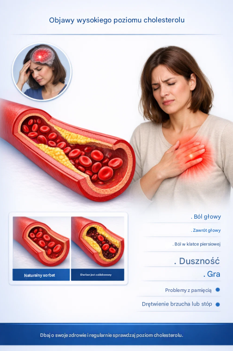 Ważna uwaga: Wymienione objawy mogą mieć wiele różnych przyczyn i nie muszą wynikać wyłącznie z podwyższonego poziomu cholesterolu. Jedynym wiarygodnym sposobem jego oceny pozostaje badanie krwi, wykonane zgodnie z zaleceniami specjalisty.