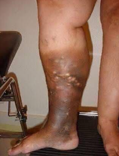 Na obrazie widoczna jest silnie opuchnięta noga z wyraźnym obrzękiem, ciemnymi przebarwieniami skóry oraz zaznaczonymi, nieprawidłowo funkcjonującymi żyłami. Taki wygląd kończyny dolnej nie jest jedynie problemem estetycznym. To widoczny objaw zaawansowanego procesu chorobowego.