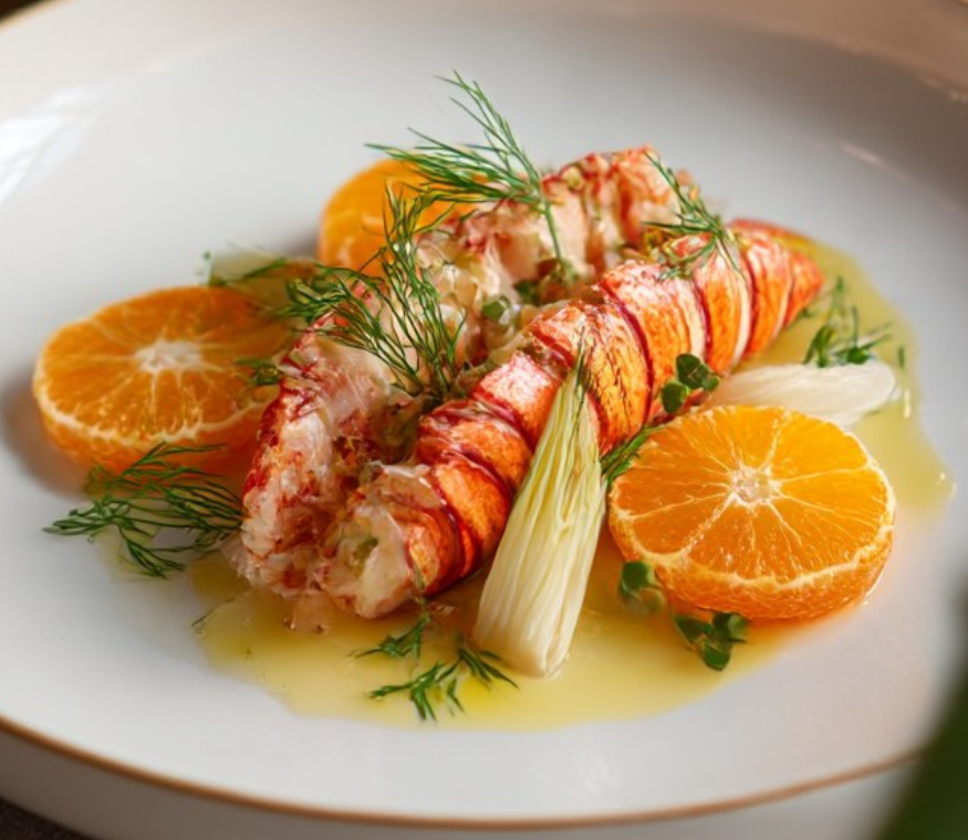 Pieczony ogon homara, konfiturowany fenkuł, suprémy z pomarańczy oraz beurre blanc z nutą pomarańczy i koperku to przystawka idealna na świąteczny lub wyjątkowy stół. W założeniu jest prosta i czytelna w smaku, ale wymaga staranności, precyzji i dbałości o detale. To danie, w którym liczy się jakość produktu, delikatność obróbki i harmonia pomiędzy słodyczą skorupiaka, anyżową nutą fenkułu oraz kwasowo-maślanym charakterem sosu.