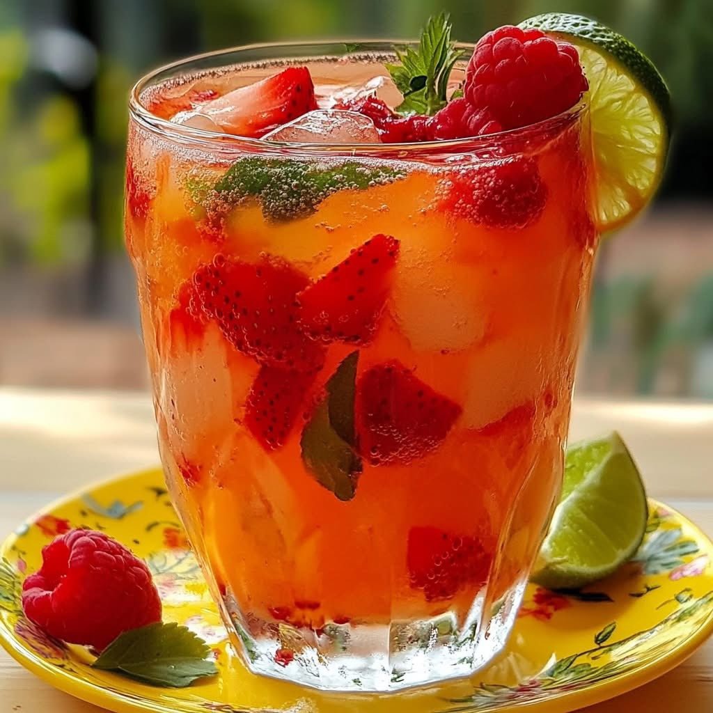Orzeźwiający poncz z czerwonych jagód to lekki, kolorowy i niezwykle przyjemny napój, który doskonale sprawdzi się zarówno podczas letnich spotkań z przyjaciółmi, rodzinnych przyjęć, jak i jako bezalkoholowa propozycja do codziennego relaksu. Połączenie truskawek, malin, cytrusów i mięty daje harmonijny balans słodyczy i kwasowości, a dodatek wody gazowanej sprawia, że napój jest lekki i wyjątkowo odświeżający.