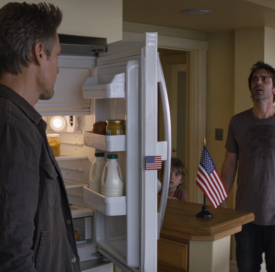 Nie odwrócił się od razu. Jego ramiona uniosły się i opadły raz, powoli, jakby przypominał sobie, że trzeba oddychać. Palce zacisnęły się na drzwiach lodówki, aż zbielały kostki.