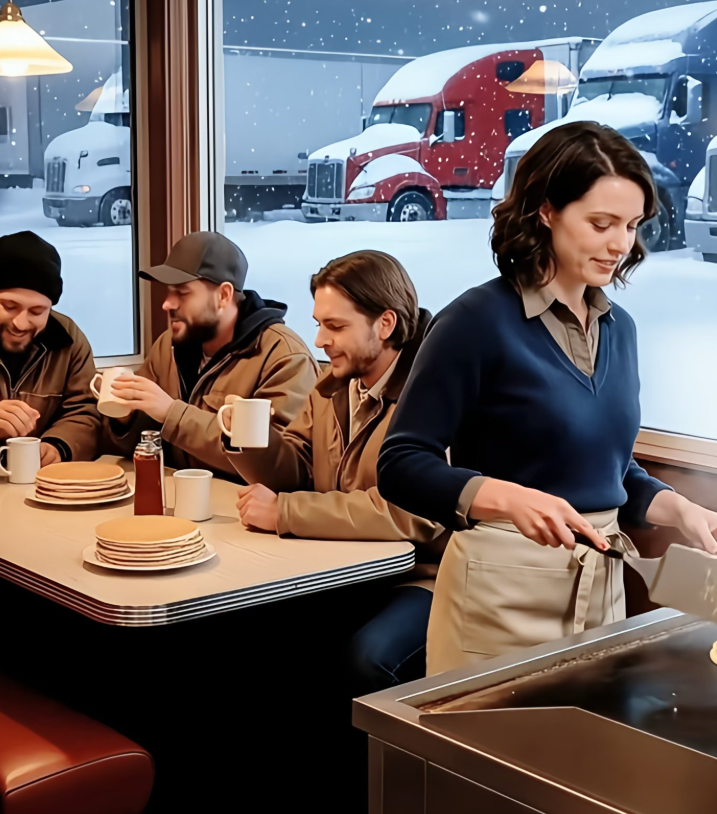 Strzepywali śnieg z butów i w ciszy zajmowali miejsca w boksach. Nastawiałam dzbanek za dzbankiem kawy, wyrabiałam ciasto, przewracałam naleśniki i smażyłam bekon, jakby nagle nastał poranny szczyt. Z czasem cisza ustąpiła szeptom, potem rozmowom, aż w końcu śmiech wypełnił salę. Dziękowali mi raz po raz, żartując, że jestem „aniołem w fartuchu”.