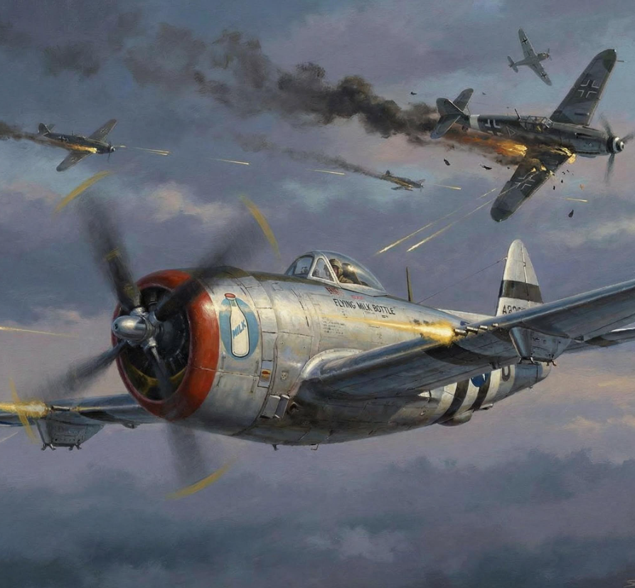 Wiosna 1943 roku. Nad kanałem La Manche piloci Luftwaffe dostrzegają nadlatujące amerykańskie myśliwce i… wybuchają śmiechem. Ciężkie, masywne samoloty nie przypominały w niczym smukłych maszyn, na których latali Niemcy. Niemiecka łączność radiowa aż iskrzyła od kpin. „Latające butelki na mleko” – tak je nazywali. Republic P-47 Thunderbolt ważył około 7 800 funtów i wyglądał jak powolny, nieporadny kawał metalu.