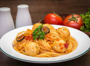 Spaghetti z klopsikami z kurczaka w aromatycznym sosie pomidorowym