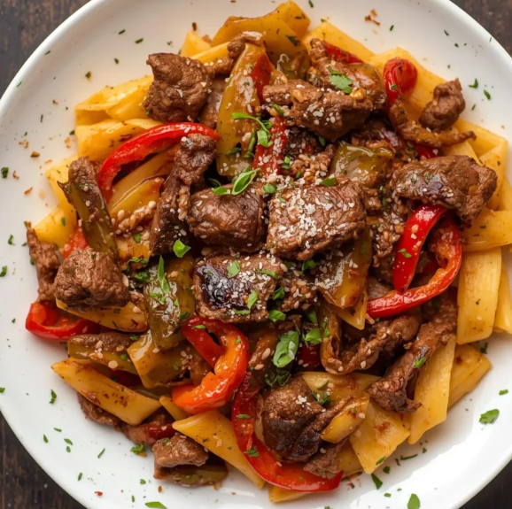 Pâtes au bœuf sauté et poivrons, czyli makaron z wołowiną smażoną i papryką, to danie, które doskonale oddaje ducha domowej kuchni: jest sycące, kolorowe, aromatyczne i pełne przyjaznej prostoty. Łączy w sobie delikatność dobrze podsmażonej wołowiny, naturalną słodycz oraz chrupkość papryki, a także uniwersalność makaronu, który chłonie wszystkie smaki i aromaty sosu. To propozycja, która sprawdzi się zarówno jako szybki obiad w tygodniu, jak i jako danie serwowane podczas kolacji z rodziną lub przyjaciółmi.