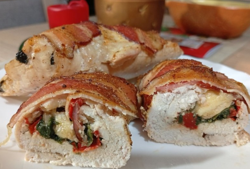 Pieczone nadziewane roladki drobiowe to doskonała propozycja na niedzielny obiad lub rodzinne spotkanie przy stole. Danie jest aromatyczne, sycące i efektowne, a jednocześnie nie wymaga skomplikowanych technik kulinarnych. Delikatne mięso z kurczaka, soczyste nadzienie warzywne, ciągnąca się mozzarella i wędzony boczek tworzą połączenie, które z pewnością przypadnie do gustu zarówno dorosłym, jak i dzieciom.