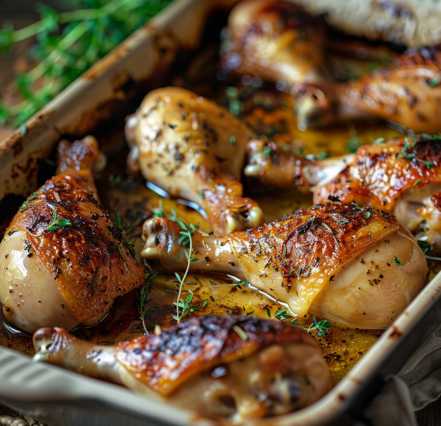 Dzięki krótkiej marynacie i pieczeniu w piekarniku mięso pozostaje soczyste w środku, a skórka staje się złocista i lekko chrupiąca. Miodowy sos w połączeniu z czosnkiem i tymiankiem tworzy delikatnie karmelizującą się glazurę, która pięknie oblepia pałki i nadaje im apetyczny wygląd.
