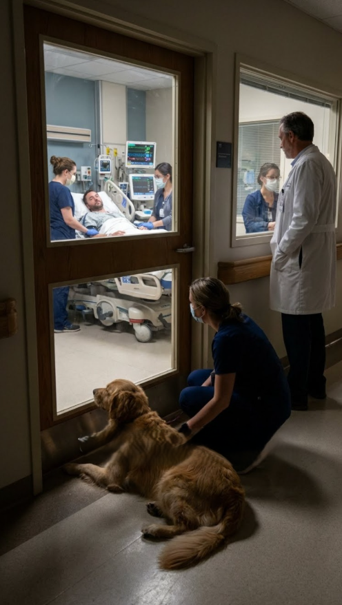 Nie szczekał. Nie skomlał. Nie próbował się przedrzeć do środka. Po prostu tam był — nieruchomy, skupiony, z oczami utkwionymi w zamkniętych drzwiach oddziału, jakby cały jego świat zawęził się do tego jednego punktu. Cooper nie odchodził nawet na chwilę. Personel próbował go odciągnąć, zaproponować wodę, koc, miejsce w poczekalni. Bez skutku.