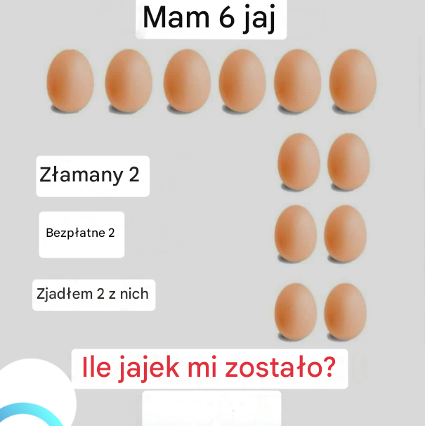 Miałem 6 jajek. Rozbiłem 2, żeby je usmażyć i zjeść. Ile jajek mi zostało?