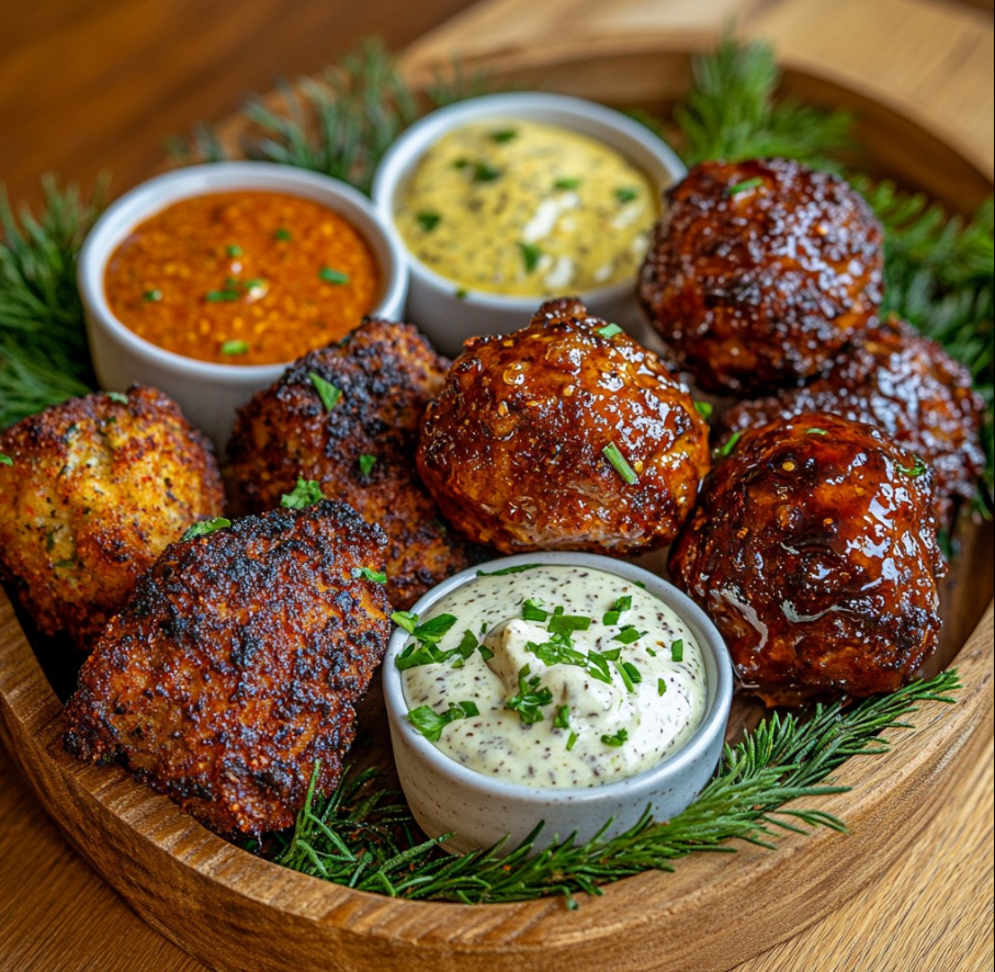 Półmisek pieczonych klopsików i karmelizowanych skrzydełek to efektowne, sycące i niezwykle uniwersalne danie, które doskonale sprawdzi się zarówno na rodzinny obiad, jak i na spotkanie z przyjaciółmi. Połączenie soczystego mięsa, chrupiącej skórki oraz trzech wyrazistych, pikantnych sosów sprawia, że każdy znajdzie tu coś dla siebie. Całość można przygotować stosunkowo szybko, bez skomplikowanych technik, a efekt końcowy prezentuje się niemal jak z restauracji.