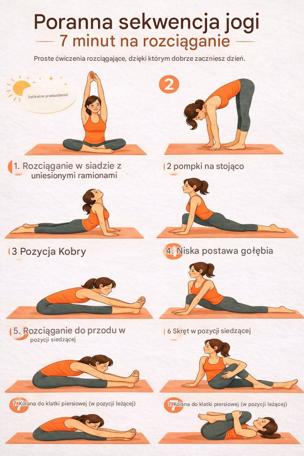 Poranna sekwencja jogi to krótka, spokojna i skuteczna rutyna rozciągająca, która pomaga łagodnie obudzić ciało i umysł. Całość zajmuje około siedmiu minut, dzięki czemu łatwo włączyć ją do codziennego porannego rytuału, nawet przy napiętym harmonogramie. Ćwiczenia zostały dobrane tak, aby stopniowo aktywować mięśnie, zwiększyć zakres ruchu i przygotować ciało do dalszej aktywności w ciągu dnia.