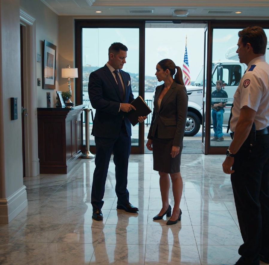 Obok niej stał Bronson, jej mąż — spokojny, opanowany, stukający teczką o nogę. Za nimi dwaj pracownicy przeprowadzkowi w granatowych koszulach, zaspani i wyraźnie niepewni, czy biorą udział w czymś legalnym, czy w czymś bardzo problematycznym.