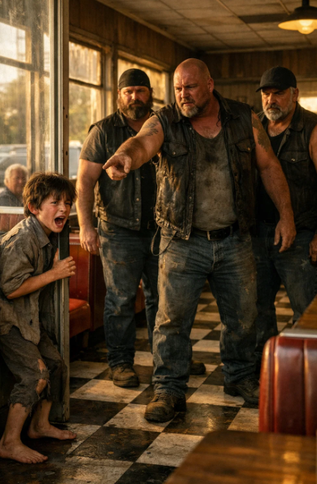 W tylnej loży, częściowo skrytej w cieniu wypchanego jelenia i migającego neonu reklamującego domowe ciasta, siedmiu mężczyzn jadło w milczeniu. Ich skórzane kamizelki nosiły ślady lat użytkowania, ciężkie buty pewnie spoczywały na kafelkach, a ich motocykle stały zaparkowane na zewnątrz — cierpliwe, jak zwierzęta czekające na wezwanie drogi.