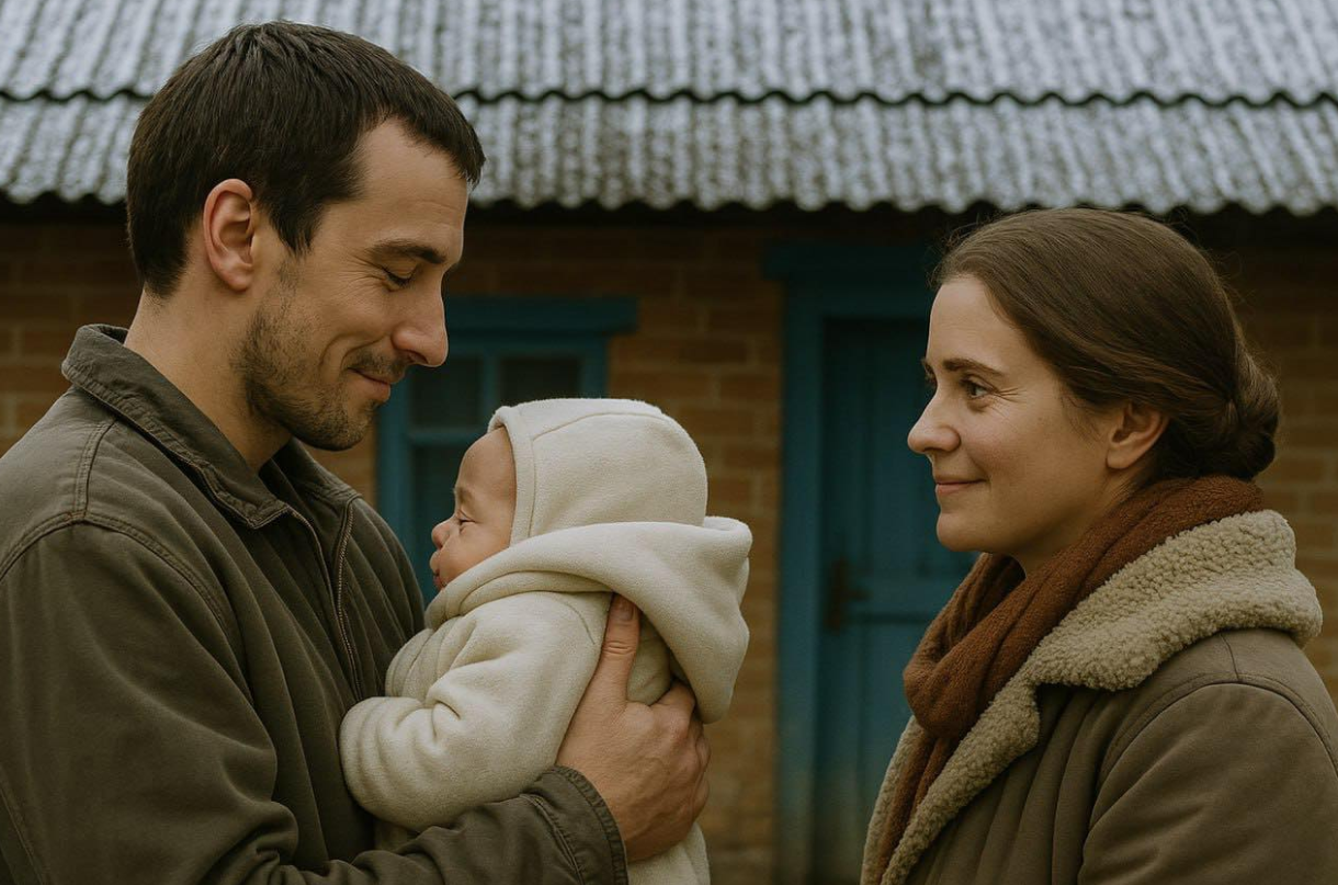 Podeszła ostrożnie do drzwi, uchyliła je tylko na tyle, by zobaczyć sylwetkę stojącą w ciemności. Przed nią stał mężczyzna około czterdziestki, ubrany w cienką kurtkę, której rękawy były całkowicie przemoczone. Na rękach trzymał niemowlę szczelnie owinięte w koc.