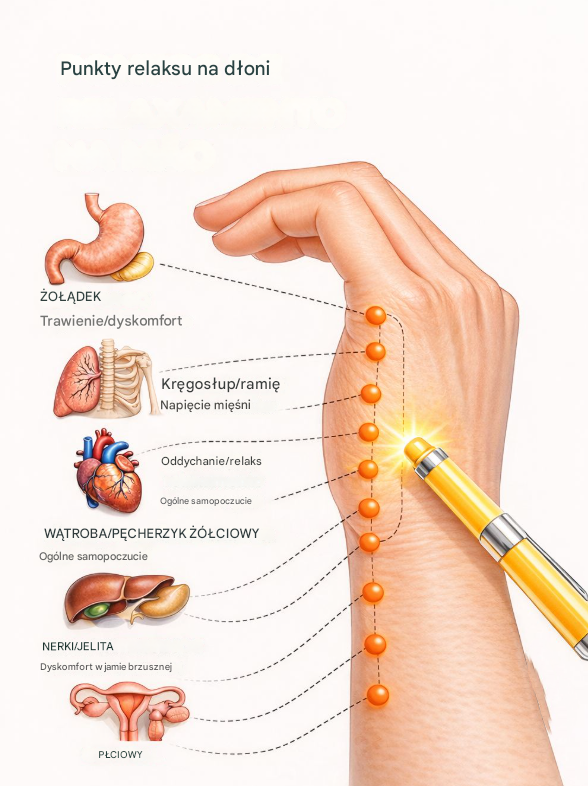 Dłoń jest obszarem bardzo wrażliwym, bogatym w zakończenia nerwowe. Poprzez świadomy ucisk wybranych miejsc można wspierać uczucie odprężenia całego ciała. Kluczem jest spokój, regularność i uważne wsłuchiwanie się w sygnały organizmu.