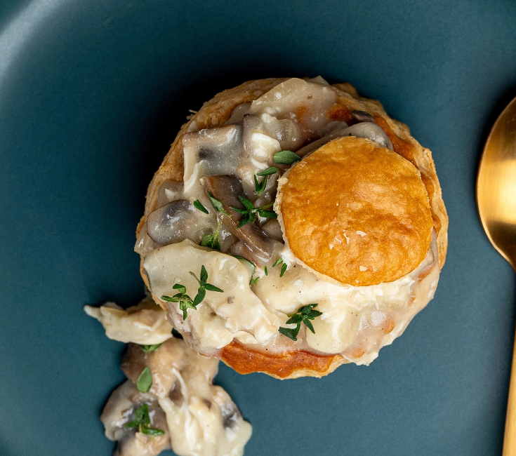 Ragout z kurczaka charakteryzuje się łagodnym, harmonijnym smakiem, który można łatwo dopasować do własnych preferencji. Dodatek pieczarek, aromatycznego tymianku oraz musztardy sprawia, że farsz jest wyrazisty, ale nadal klasyczny. Jeśli nie przepadasz za kurczakiem, nic nie stoi na przeszkodzie, aby przygotować to danie również w wersji wegetariańskiej, zastępując mięso większą ilością pieczarek.