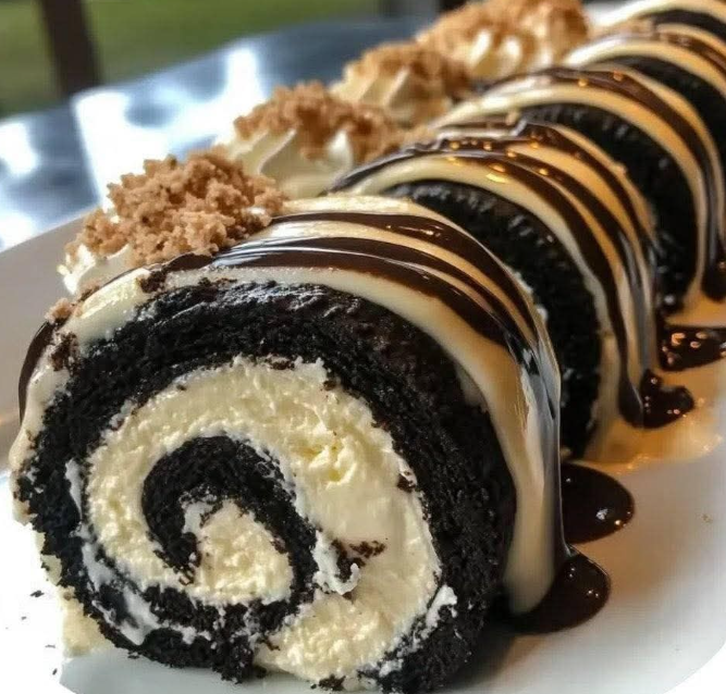 W tym deserze kluczową rolę odgrywa kontrast. Delikatny biszkopt czekoladowy stanowi bazę, która jest na tyle miękka, by łatwo ją zwinąć, a jednocześnie wystarczająco sprężysta, by utrzymać nadzienie. Krem z serka śmietankowego wnosi subtelną kwaskowatość i aksamitność, natomiast kawałki ciasteczek Oreo dodają przyjemnej chrupkości i rozpoznawalnego smaku. Całość dopełnia biała czekolada, która równoważy intensywność kakao i ciasteczek.