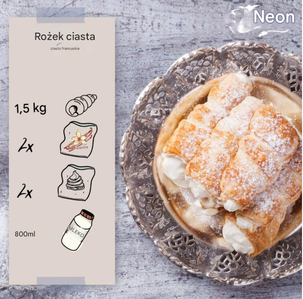 Ten przepis pozwala uzyskać dużą porcję rożków, idealnych do podania gościom lub na kilka dni słodkiej przyjemności. Dzięki zastosowaniu żelatyny krem jest stabilny, dobrze trzyma formę i nie wypływa z ciasta, nawet po dłuższym czasie.