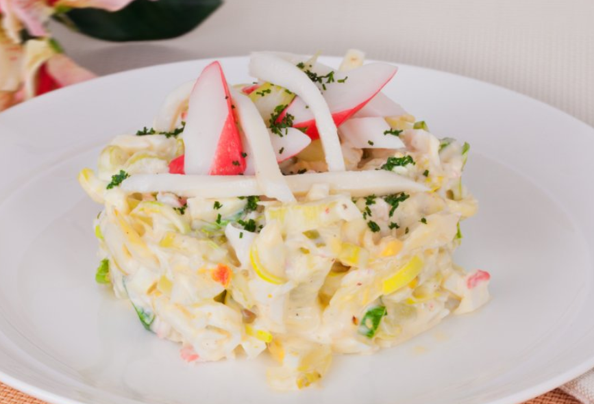 Delikatne paluszki surimi, jajka na twardo, łagodny ser żółty oraz słodki ananas przełamany kukurydzą tworzą ciekawy kontrast smaków. Całość dopełnia kremowy sos na bazie majonezu i jogurtu naturalnego, który nadaje sałatce aksamitnej konsystencji i lekkości.