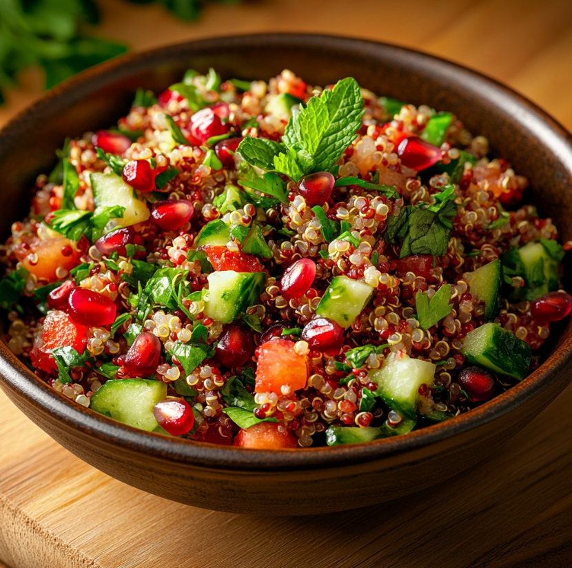 Sałatka z quinoa z dodatkiem świeżych ziół i granatu to lekka, świeża i bardzo uniwersalna propozycja, która doskonale sprawdzi się zarówno jako samodzielne danie, jak i jako dodatek do innych potraw. Jej smak opiera się na harmonijnym połączeniu delikatnej quinoa, chrupiących warzyw, aromatycznych ziół oraz słodko-kwaśnych ziaren granatu.