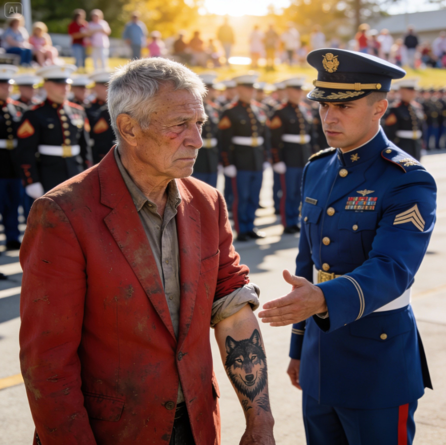 „Ładny rysunek” — syknął, na tyle głośno, że rodziny wokół nas słyszały każde słowo. „Niech zgadnę. Klub motocyklowy? A może po prostu chciał pan wyglądać groźnie?” Pokręcił głową z obrzydzeniem. „Ludzie tacy jak pan przychodzą tu, chcą poczuć się częścią braterstwa, bawią się w przebieranki z wojskową symboliką. To brak szacunku dla ludzi, którzy naprawdę zapracowali na swoje miejsce na tym placu.”