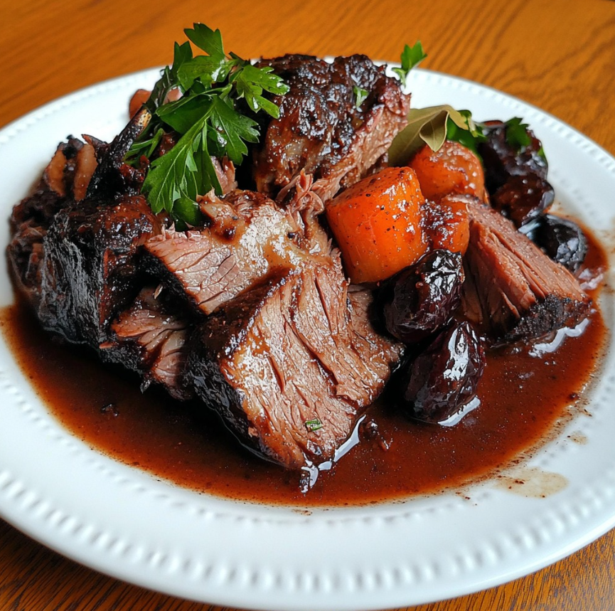 Sanglier braisé au cacao i czarnych śliwkach to danie wyjątkowe, głębokie w smaku i niezwykle aromatyczne, inspirowane kuchnią myśliwską oraz tradycyjnymi metodami długiego duszenia. Połączenie dziczyzny z gorzkim kakao i owocową słodyczą śliwek tworzy harmonijną, elegancką kompozycję, idealną na uroczysty obiad lub kolację w chłodniejsze dni.