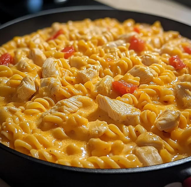 Ser topiony i zupa krem z kurczaka tworzą bogaty, ale nie przytłaczający sos. Mleko sprawia, że sos równomiernie pokrywa makaron, a pomidory Rotel dodają świeżości i delikatnej ostrości. Kurczak uzupełnia całość białkiem i głębią smaku.