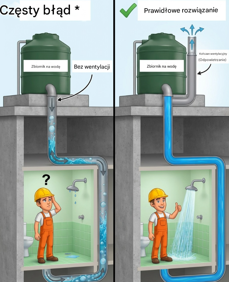 Gdy woda spływa bezpośrednio ze zbiornika do instalacji, a system nie ma odpowiedniej wentylacji, w rurach zaczynają gromadzić się pęcherze powietrza. Powietrze to nie ma ujścia i tworzy swoisty „korek”, który utrudnia swobodny przepływ wody.