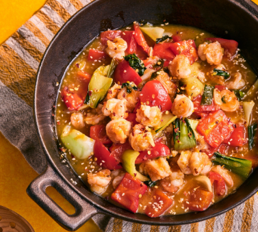 Soczyste krewetki, chrupiące warzywa oraz gęsty, aromatyczny sos sprawiają, że potrawa jest sycąca i dobrze zbilansowana. Można ją podawać zarówno z ryżem, jak i z makaronem, co czyni ją elastycznym wyborem na obiad lub kolację. Dzięki technice szybkiego smażenia składniki zachowują swoją strukturę, kolor i naturalny smak.