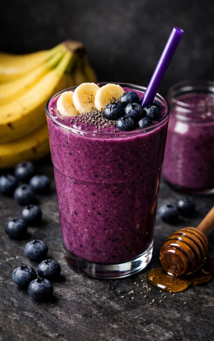 Wszystkie składniki są łatwo dostępne i nie wymagają specjalnego przygotowania. Dojrzałe banany zapewniają naturalną słodycz i gładką konsystencję, jagody wprowadzają lekką kwaskowość, a jogurt nadaje smoothie przyjemną kremowość. Mleko migdałowe sprawia, że napój jest delikatny i lekki, a miód pozwala subtelnie podkreślić smak owoców.