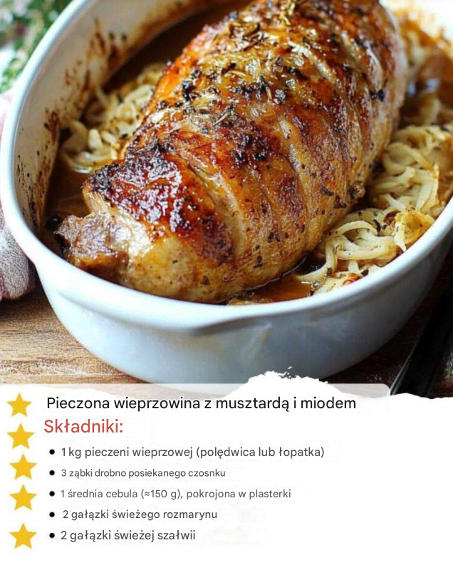 Przepis bazuje na łatwo dostępnych składnikach, które razem tworzą harmonijną całość. Miód nadaje mięsu subtelną słodycz i sprzyja pięknemu karmelizowaniu w trakcie pieczenia, natomiast musztarda wnosi charakterystyczną ostrość i głębię. Dzięki powolnej obróbce cieplnej pieczeń pozostaje soczysta, miękka i pełna aromatu.